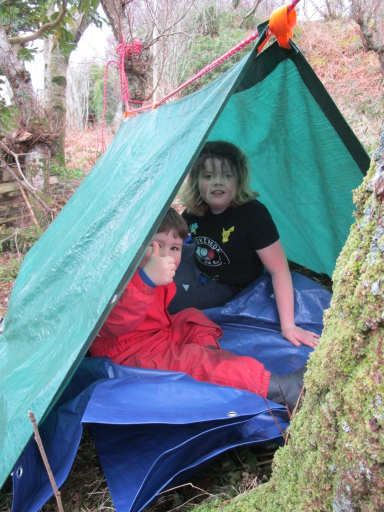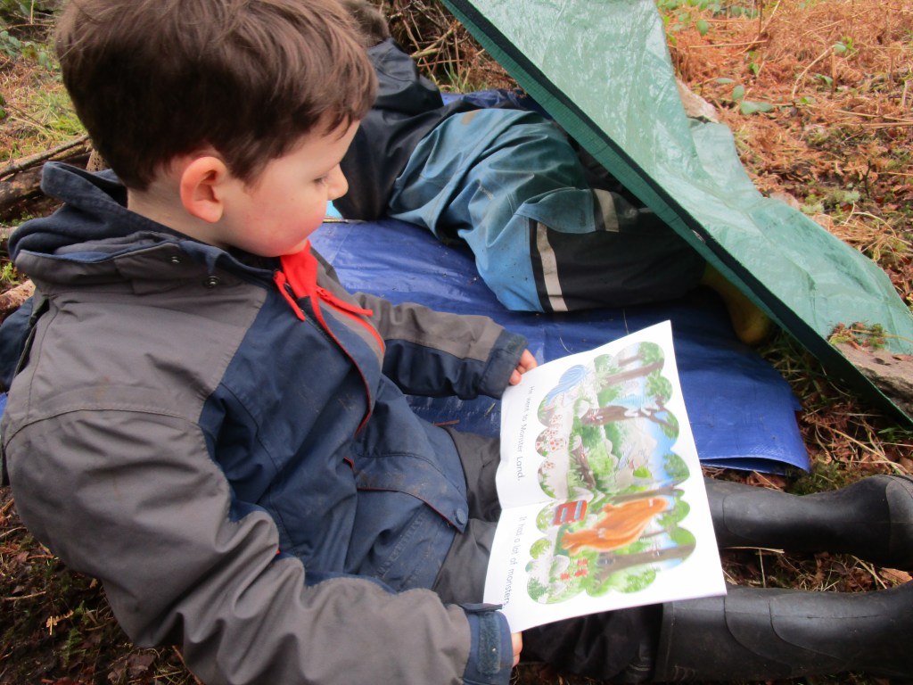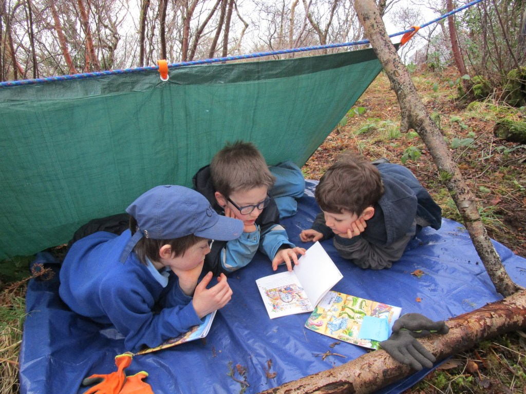 In our Forest School sessions the children have been working on their shelter-building skills. They learnt how to tie a rope between two trees to make a taught ridge-line, using a hitch which could easily be undone, and made small shelters that would protect them from the prevailing wind and rain using a tarpaulin. The children enjoyed using these to share their core reading books together. We have established a Forest School seating circle where we can enjoy games and activities together, using logs which were kindly donated to the school. The children have chosen their ‘favourite’ log, which we will decorate with their names in future sessions.