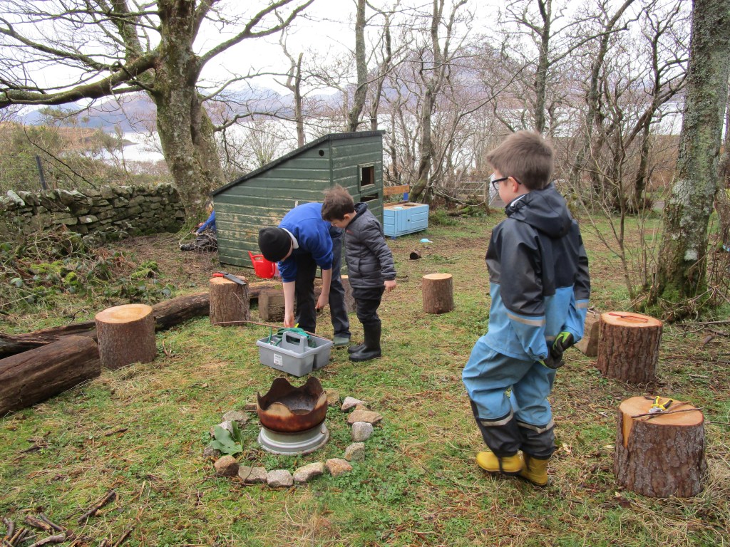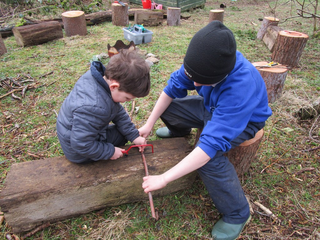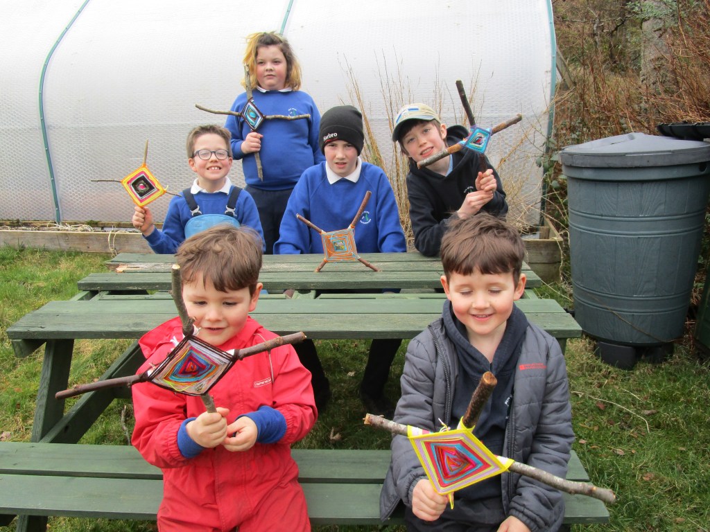 Today, in Forest School, pupils were learning to do some ‘God’s Eye’ weaving. This involved measuring lengths of stick and sawing them – they had to make sure both pieces were the same length. They then used colourful wools to create their own patterns.