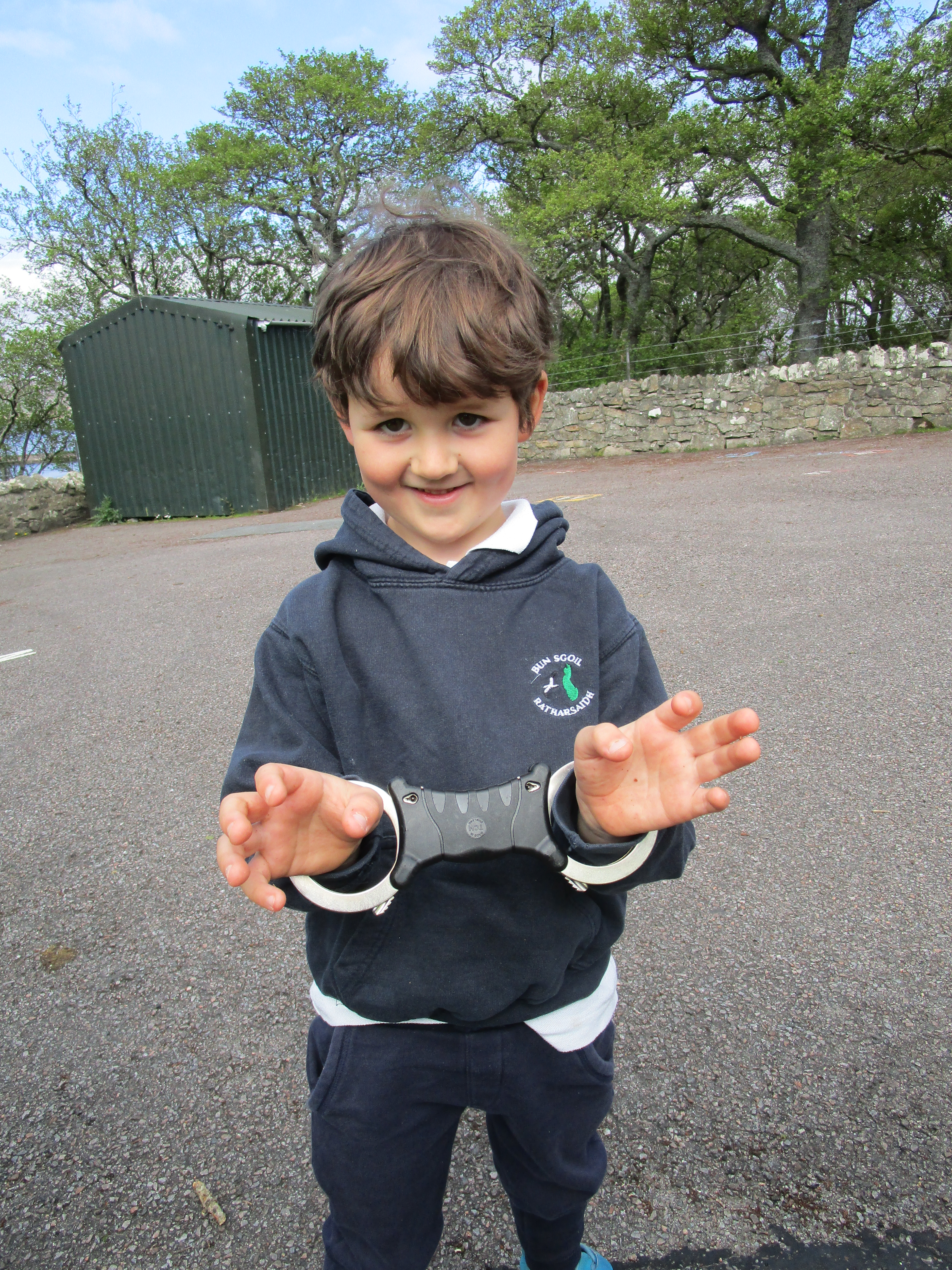 You may have heard Police sirens on Raasay yesterday – don’t worry, it wasn’t a major emergency – just a visit from our friendly Police Liaison Officers! We were delighted to welcome PC Nicola Grant, Police Liaison Officer and PC Aileen Logan. The children had the opportunity to ask questions about the life of a Police Officer, find out about their kit and also try out some of the equipment. As you can see, some pupils were breathalysed – but fortunately, all were negative! The officers hope to return before the end of term – and this time, they will be bringing the speed gun! We were especially pleased that the officers stayed on for the afternoon to support us with our Blythswood Charity Walk. They provided a Police escort for the runners and helped to support the safety aspects of the event. The children were especially delighted to received their medals from the PC’s at the end of the race.