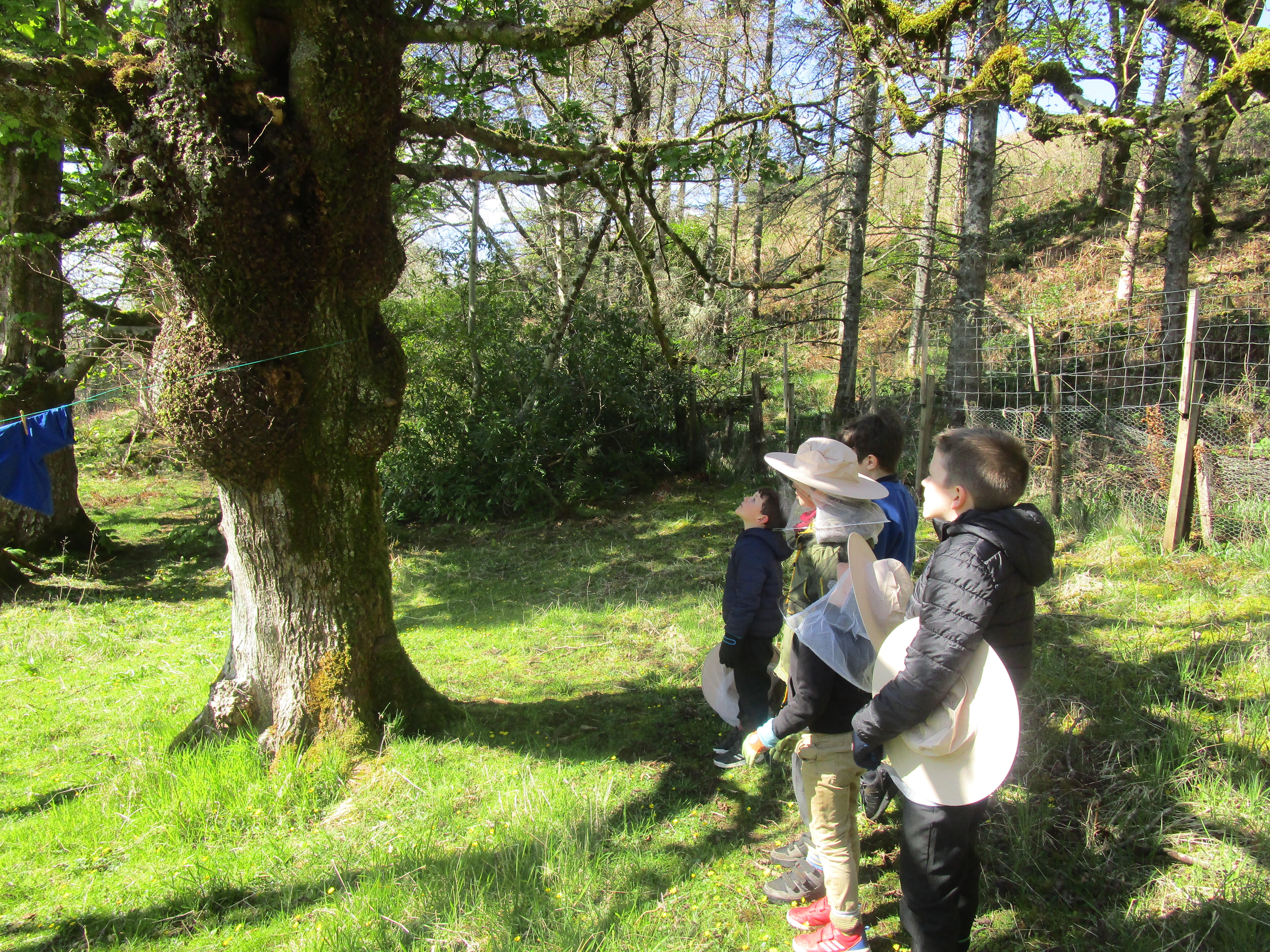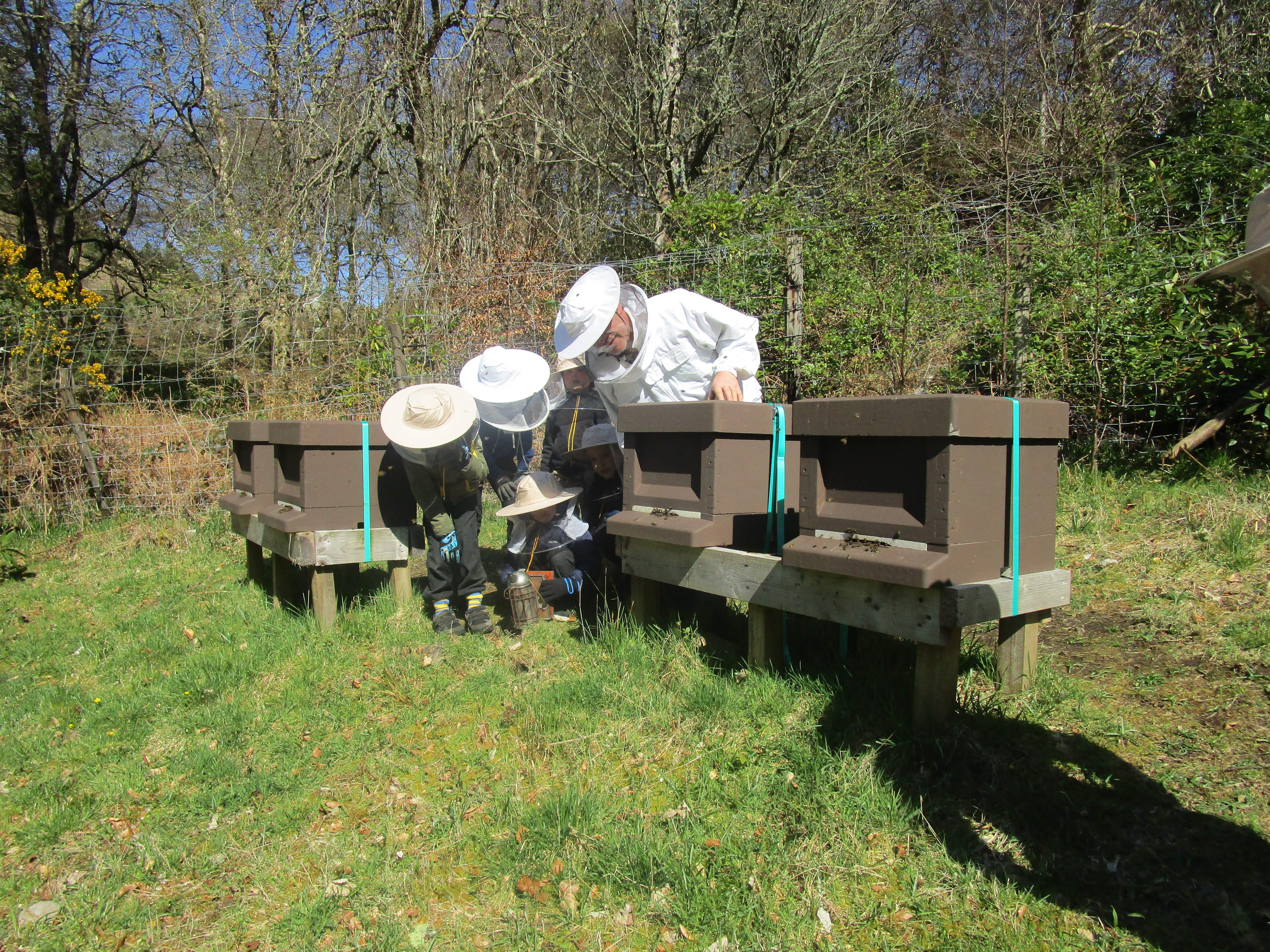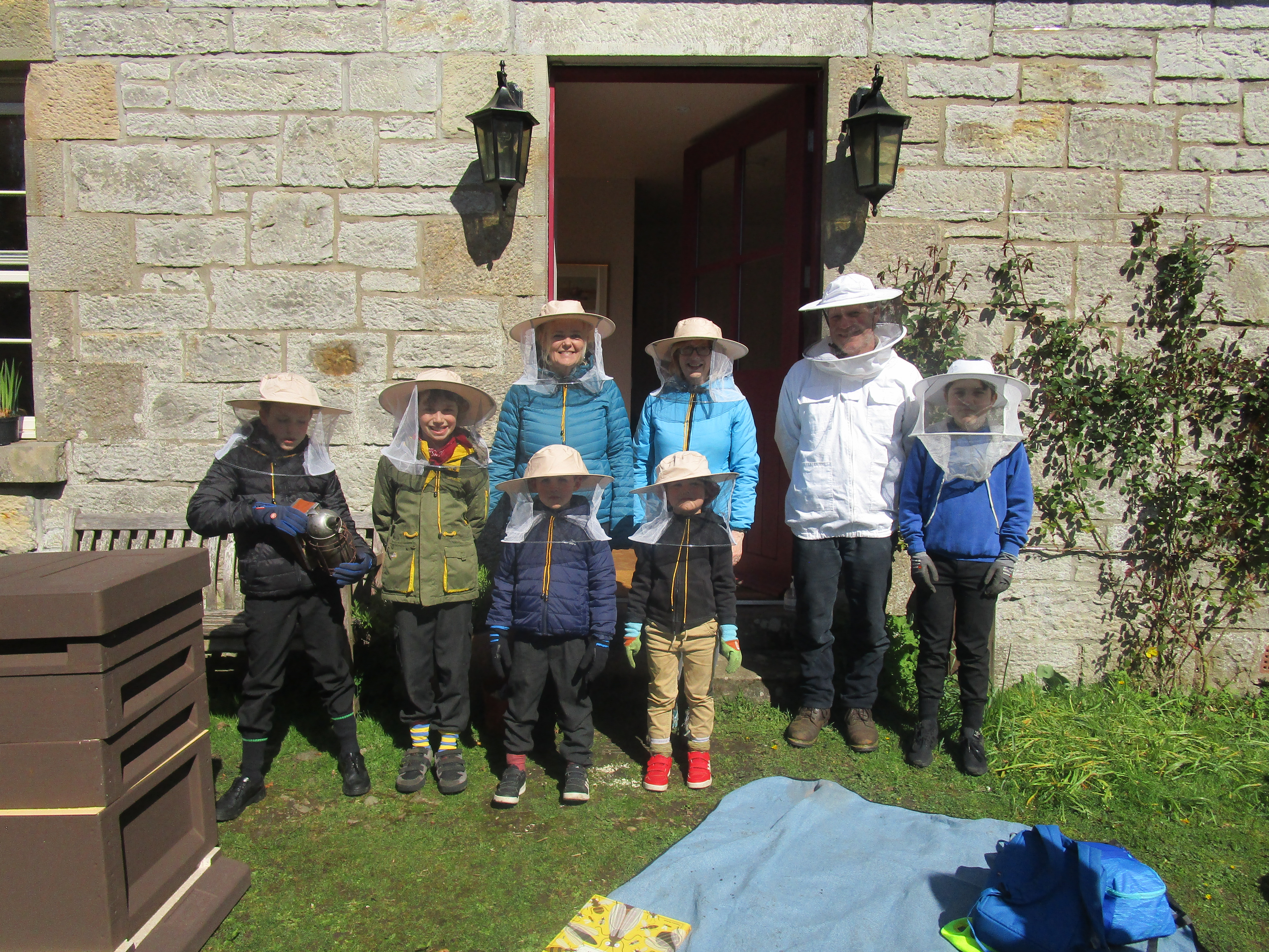 On our first week back after the Easter Holidays we have been focussing on learning about environmental issues. During our literacy, we read up about the lifecycle of bees and how important they are because they polinate flowers and help plants make fruit and vegetables. We learnt all about what the queen bee spends most of her time doing (laying eggs) and is in charge of the hive. We learnt that worker bees have many important jobs around the hive. The worker bees are also all female and they keep the hive cool by flapping their wings, they build the hive and keep it clean, protect the hive and collect pollen and nectar from flowers. We also learnt that drones have only one job – that is to mate with the queen, that bees make honey to provide food for the winter and that royal jelly is a food that is only fed to the queen and the larvae. In the summer, a queen can lay up to 2500 eggs a day and a bee flies at approximately 15kmph. Bees flap their wings about 200 times every second and a bee will only sting if it feels that it is in extreme danger. A worker bee lives for about a month and they do special dances to tell other workers where to find pollen. Around the world bees are becoming an endangered species and if there are no bees, we will have no food. We found out lots of interesting facts and we also learnt that bees are very clever and that scientists have trained them how to kick a bee sized ball into a net. Apparently they are visual learners and if they see another bee doing this then they will do it too (who knew!). Prior to our visit to see ‘real’ bees (thank you Hannah and Simon, we designed our own bee-friendly garden following some comprehension work on what made a bee-friendly garden. We did a short science experiment showing the important role bees have in polinating flowers. Each child was given a bee wrist band and a ‘flower’ – this was a paper bag with some powdery crisps inside – pupils ate the crisps to demonstrate that they were taking the nectar from the flower and then moved on to another paper bag (whereby they showed how the pollen was moved from flower to flower). After lunch we went to Hannah and Simon’s to learn about and see their bees and the honey production. We were even kitted out with special ‘bee’ hats and we got to see how beekeepers use smoke to calm the bees before removed the honeycomb frames. Simon also showed us the bottom of the hive where the queen bee lived and all the worker bees lived in a separate area. We also got to touch and smell the block of beeswax and discussed how beeswax was used in the past and even today in different products. Simon also told us that up to 60,000 could live in one of the hives at one time – if all the hives were full that would equate to around 400,000 bees. We had a very informative and interesting afternoon and we look forward to our next visit where we will be observing the extraction of the honey from the hives. In the meantime, Simon very kindly gave us a jar of Raasay honey (wild flower) which we will be having on our toast at snack time. What a fantastic opportunity to learn first hand about the importance of bees in our environment – thank you Simon and Hannah.