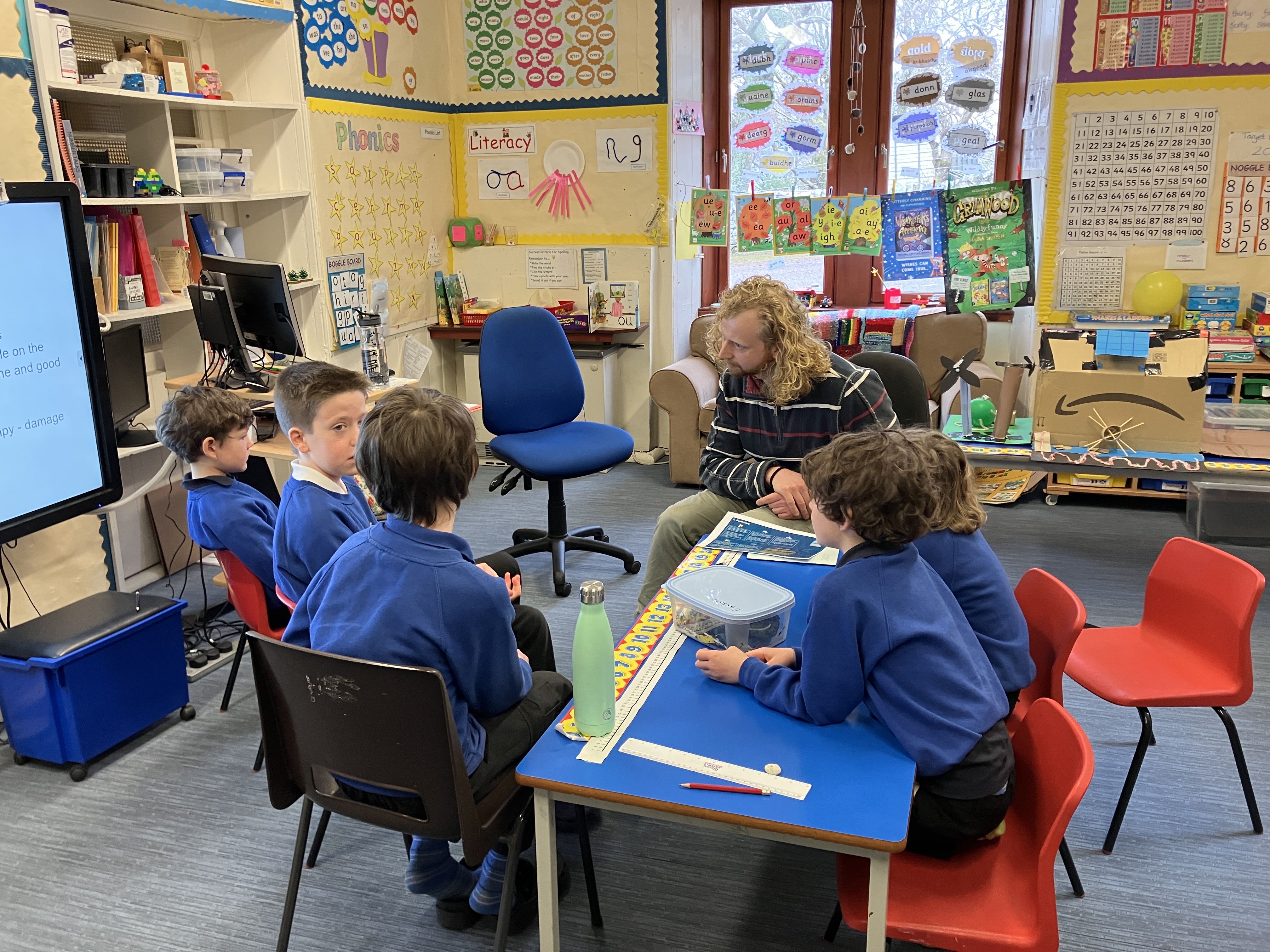 On 23rd and 24th March we were delighted to welcome Stewart Bell, Area Co-ordinator Youth Scotland, to Raasay Primary School to deliver a two day workshop on the Carbon Neutral Islands Project. The pupils were invited to tell Stewart all abour their island environment and then took him on a tour of the local area visiting many of our community areas such as the local shop, hall, fire station and Heritage walk. We included a litter pick on the way and, as there had been a storm the day before, we collected a bag full of litter which pupils later categorized and grouped into different materials. Stewart was blown away by the stunning scenery and natural environment here on Raasay. Stewart engaged with the children in various activities during the workshop including: designing and creating their own 3D model eco house; writing a letter to their future self which formed part of a time capsule to be opened 2074!; describe themselves and the things they have around them e.g. the technology they use to see how things would have changed in 50 years time. Stewart also led some after school activities such as special effects make up using biodegradable glitter and materials and parachute games. They also had the opportunity to learn about building a fire and lighting with a flint – they had to show resilience to keep going with the flint until they finally got it lit! Stewart then showed them how to safely use and pour from a Kelly kettle. As part of the two day workshop, we also had a visit from Tom Lisink, Community Energy Scotland and the children presented their CNI Transport Challenge Powerpoint.