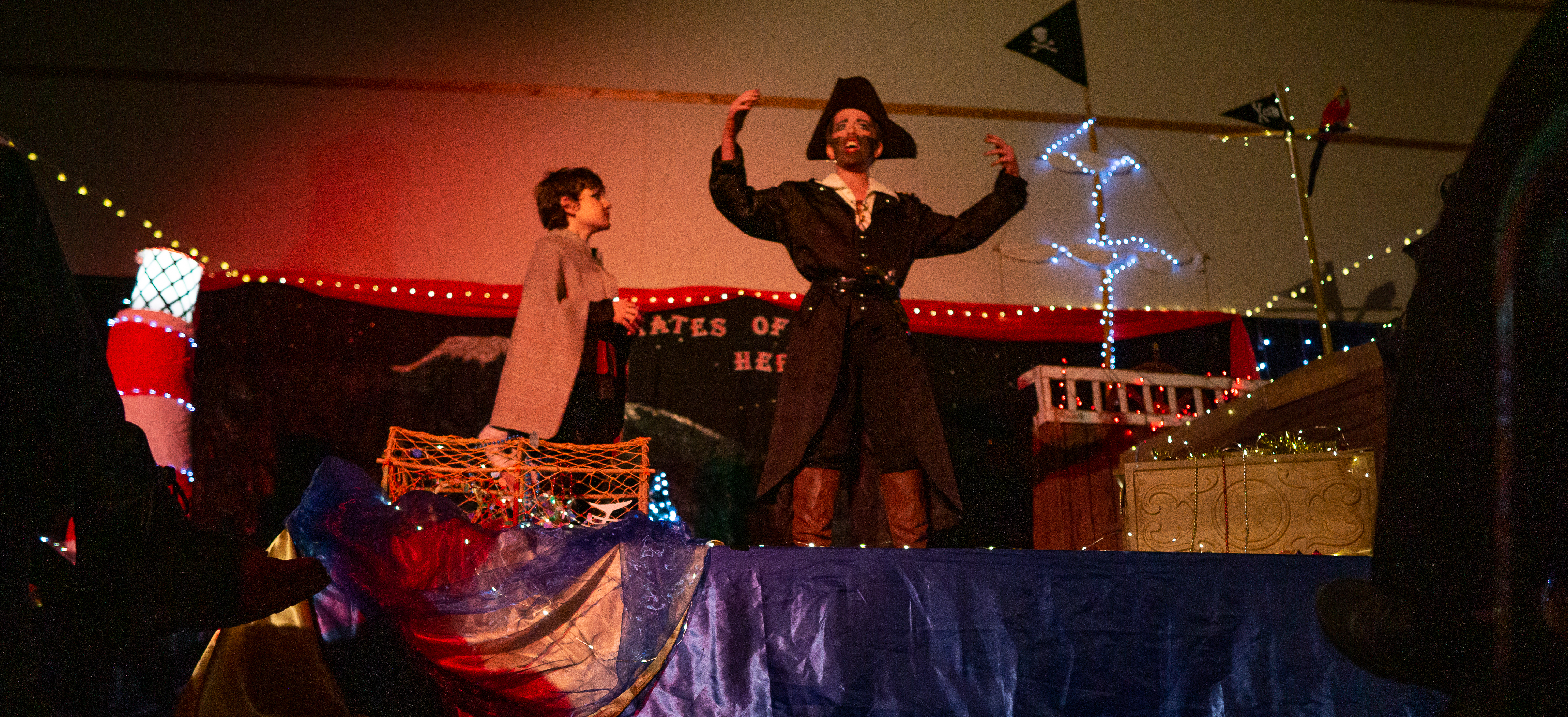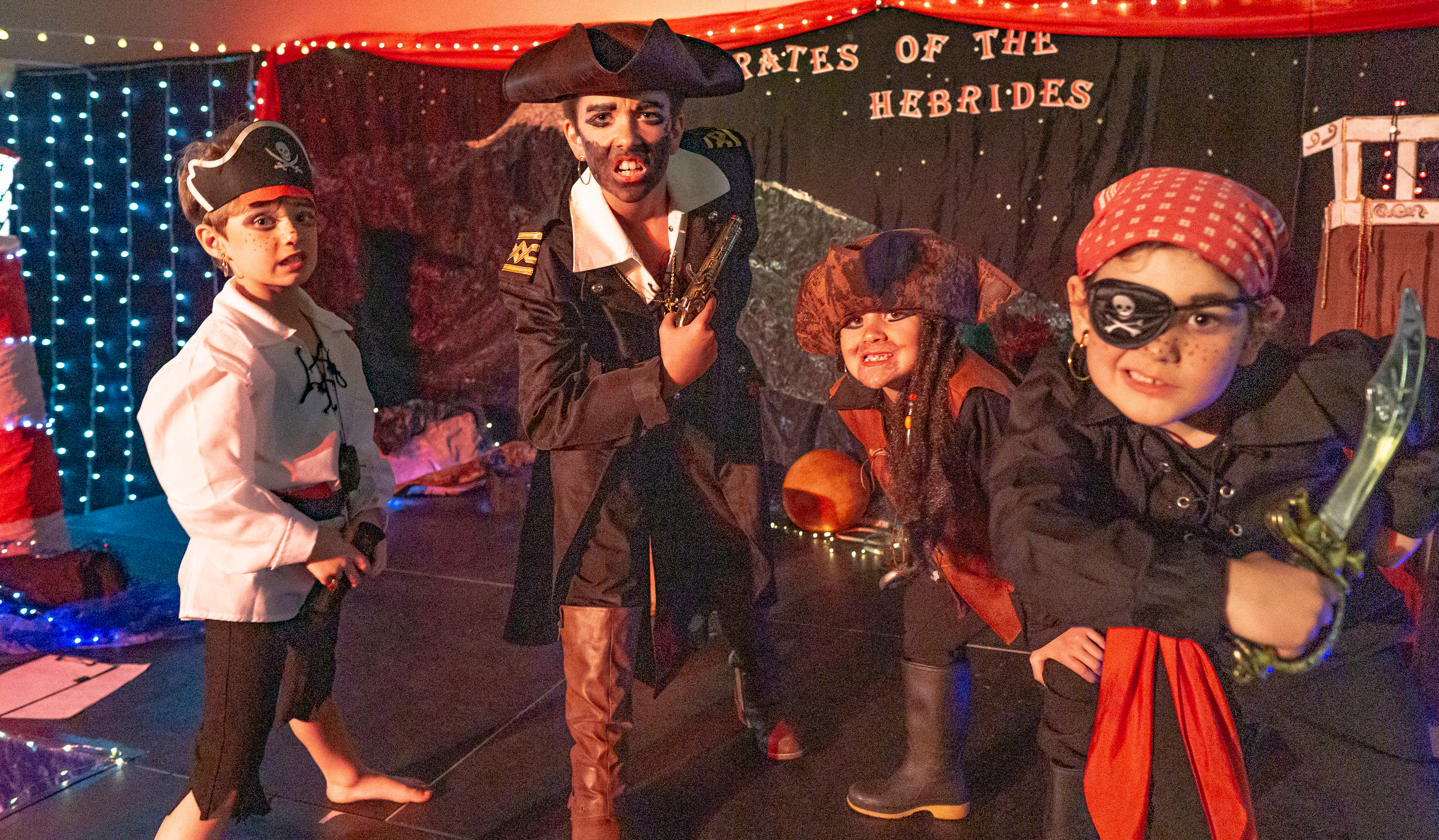 Pupils performed their original story ‘Pirates of the Hebrides’ as part of their inter-disciplinary learning focus this term. The curricular focus was talking and listening, drama, song, dance and Gaelic. The island community was welcomed aboard the ‘Cailleach Liath’ to watch the pirates tale of robbing, plundering and pillaging as they sailed the Hebridean Seas in search of treasure and wealth, They were known as the richest pirates in the west coast and their final raid would see them battling the worst storms they had ever encountered to reach Toileachas Island – the furthest outpost on the western seaboard. The audience braced themselves as they battened down the hatches. On arrival, and to the dismay of Captain Cut-Throat MacIomhair) there is the discovery that the gold and silver they had risked life and limb for are the silver seas and golden sands of Toileachas Island. The islander who meets them enlightens them that they have nothing but friendships, love and community and what they have they share. There is an awakening of the crew who discover that riches can come in other forms. The Captain and his crew discover the joy in giving and not taking; providing and not plundering and being peaceful, not pillaging. From that day forward, every Christmas Eve they are to be found sailing the Hebridean seas delivering boxes of food and gifts to neighbouring islands.