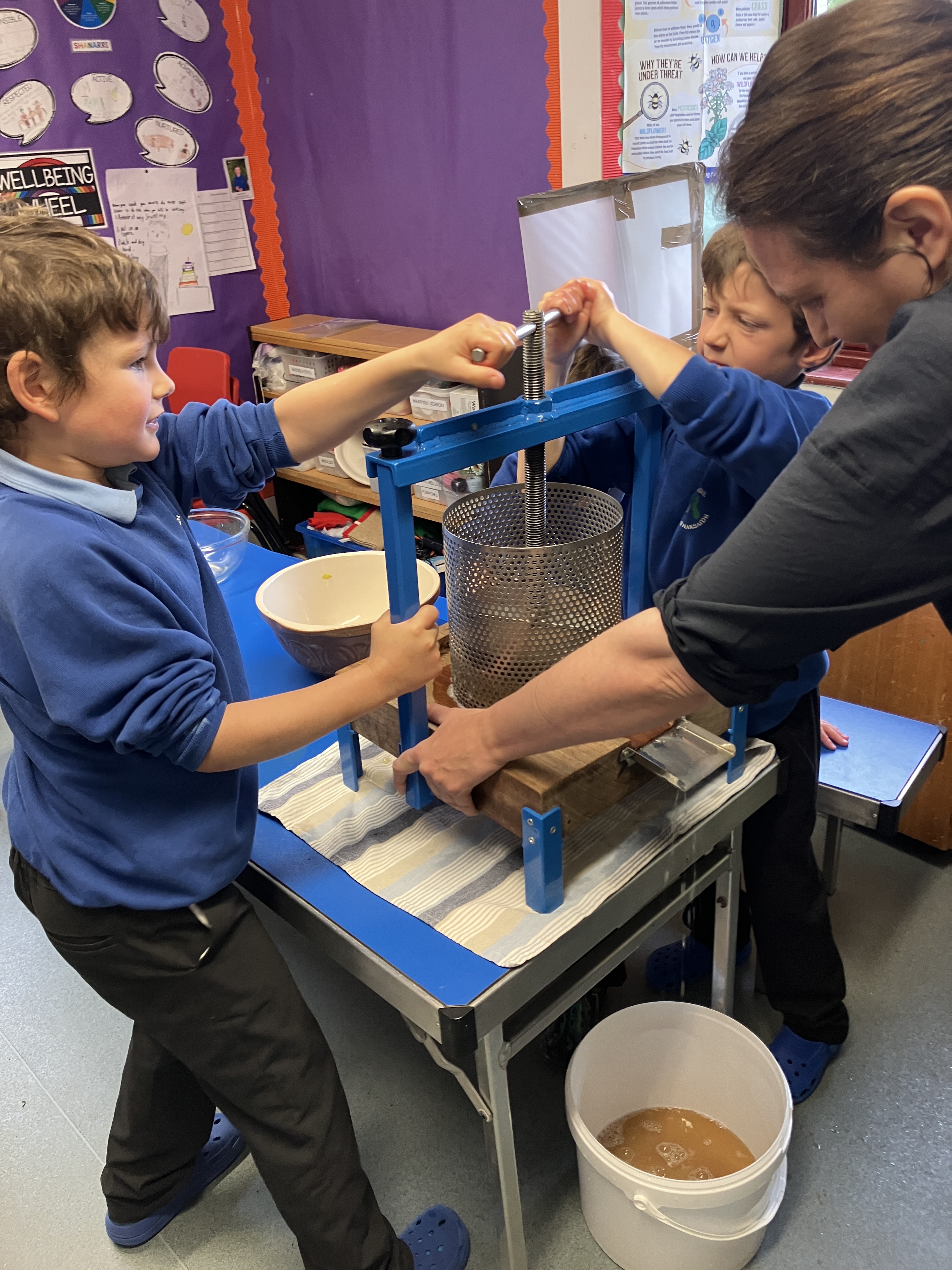Before we went on our October break, we decided to harvest what was left of our grapes in the polytunnel to make grape juice using a heather press. Hannah very kindly offered to come in with her press to show the children how to use the equipment and it was tough work! The boys had to work as a team and co-ordinate their efforts in order to get the most juice possible out of the muslin that was held in the press. This involved continuing to screw the press tighter and tighter onto the block beneath. Thirsty work! but all very worth it as the grape juice was delicious – very sweet and with a hint of the honey that had been through the press before. The boys are excited to develop this idea further as part of their ACORNS enterprise next year and harvest the grapes throughout the season to make grape juice to sell.