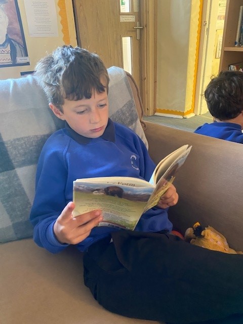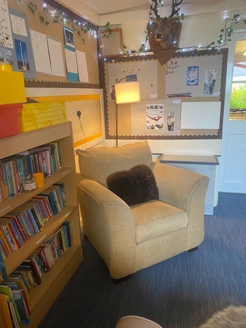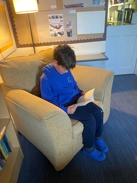 Raasay Primary School is currently undertaking the Scottish Book Trust accreditation programme – Reading Schools. This is designed to build and sustain a whole school reading culture and the award system builds from Core through to Gold. We are currently working through the requirements for the Core element and, if successful, we hope to be moving on to the Silver Action Plan in August. At their recent Pupil Council meeting, the boys identified that upgrading the library area would help to make reading for pleasure even more enjoyable. As well as their cosy couch, we now have an armchair with reading light, a clock, barometer, desk, rug, blanket, fairy lights and a world globe. The idea was to create a comfortable, cosy space where the boys can relax with a book during the school day. Pupils have D.E.A.R. (Drop Everything And Read) time every day, whereby they stop their work to pick up their reading for pleasure book Staff also have a personal reader which they can read, thereby modelling good reading practice. The boys, on occasion, visit the Nursery to read a book to the Nursery pupils and they also benefit from our sessions with Pets as Therapy dog, Freya. Of course, reading doesn’t stop with the English language and the boys are currently reading, and learning, their Gaelic poems for the local Mod.
