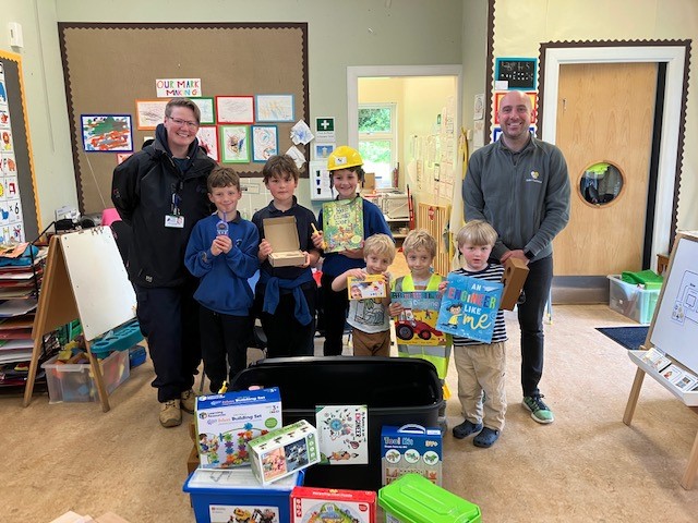 We had a visit from Diane Connolly Phillip, Project Officer from Highland Council’s Climate Change and Energy Department – who presented our school with a Talking Tub educational resource box in Energy and Construction. The box was supplied by Union Technical who are the contractors who have been carrying out energy efficiency measures to homes on Raasay. The children were delighted with the early years construction box which included: wooden construction vehicle toy set, lego education tech machine set, housebuilding bricks, hard hats, books and a range of puzzles and games. It didn’t take long for the children to have these out of the box and they have been well played with already! Pictured are the children on receiving their Talking Tub from the team.