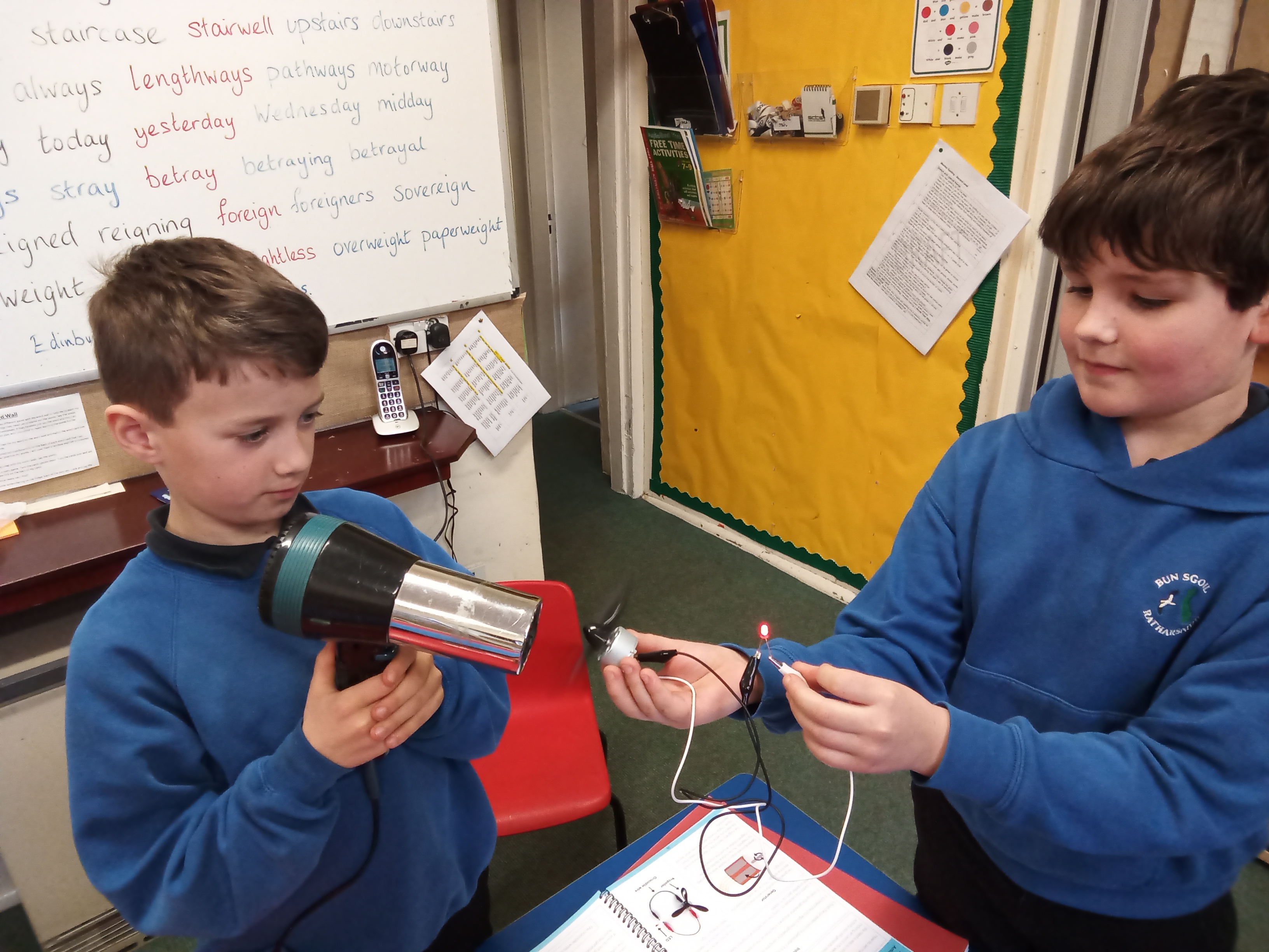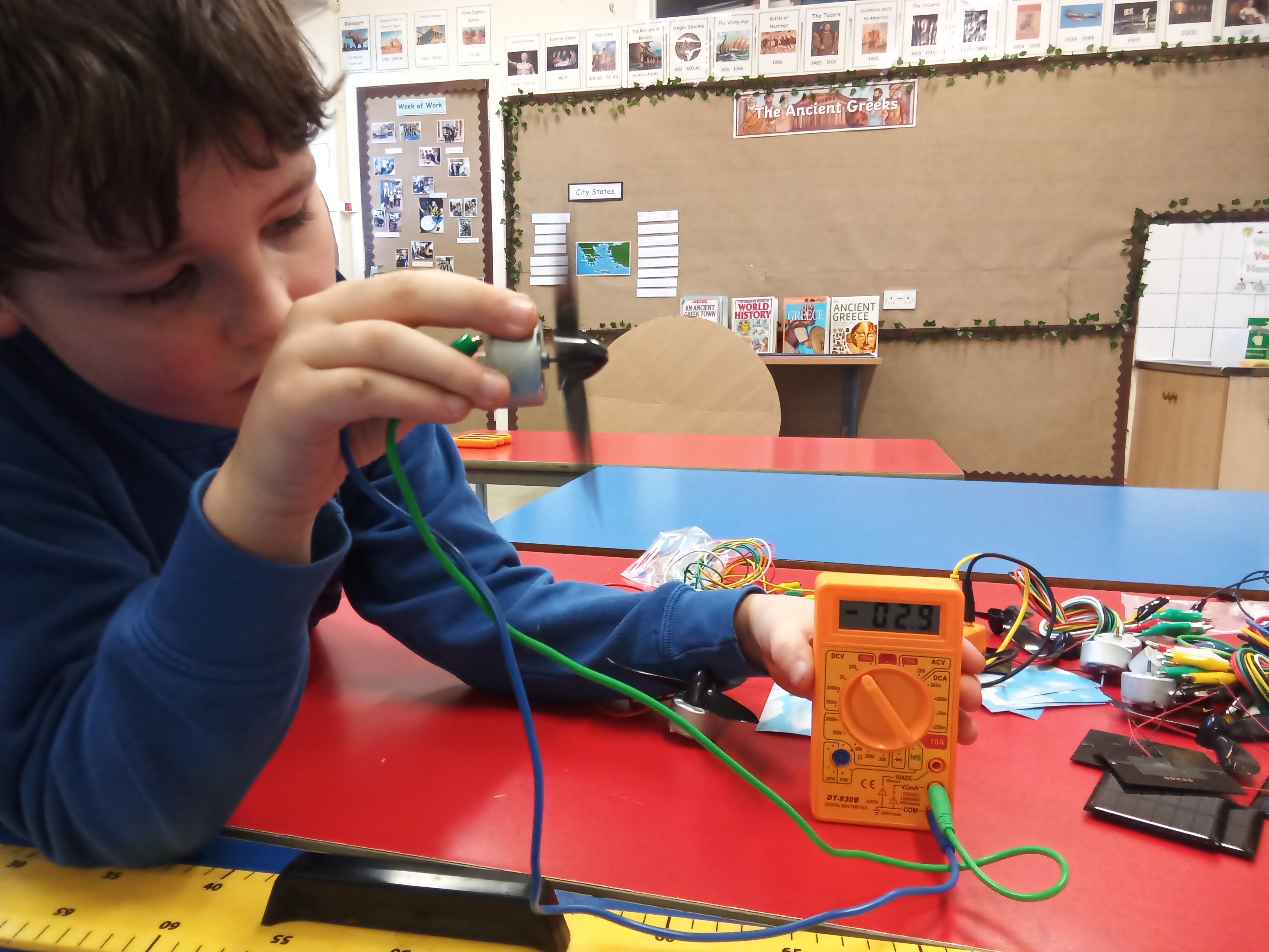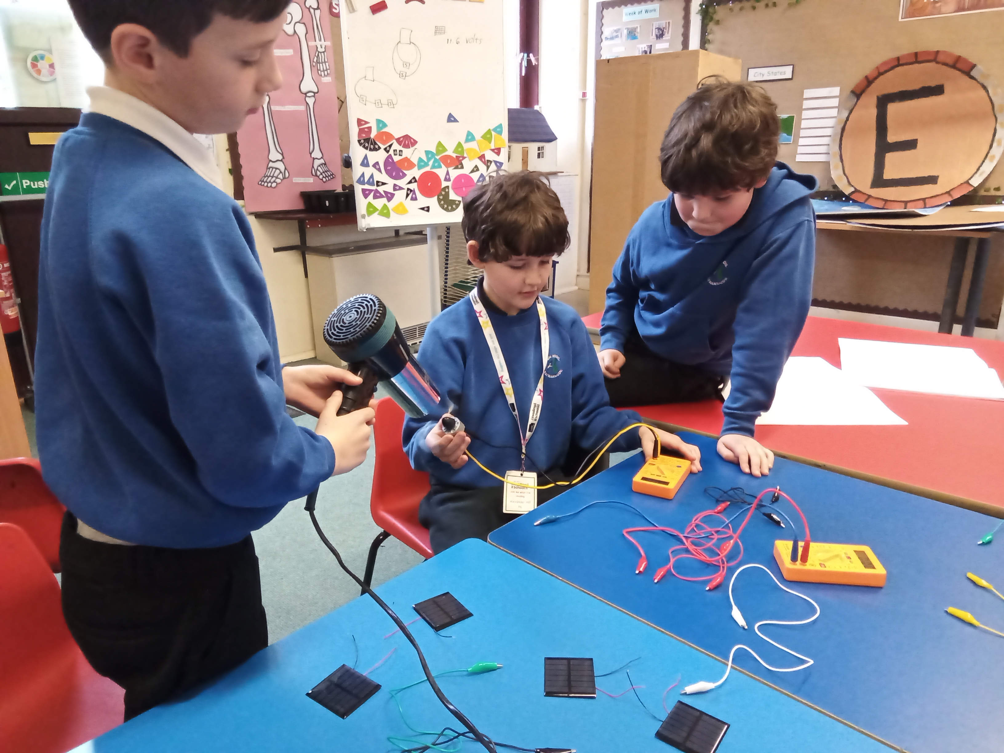 As part of their STEM topic ‘Designing a School of the Future’ pupils were tasked with finding out which sources of renewable energy would generate the most electricity. They had to experiment using solar panels and wind turbines (using a hairdryer as the wind source!). The object of the lesson was also to work together showing collaboration, communication and co-operation.